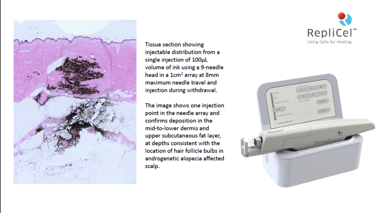 “One of the things we’ve always believed about RepliCel’s RCH-01 cell therapy, for example,” stated R. Lee Buckler, President and CEO of RepliCel Life Sciences which has developed and owns all rights to the DermaPrecise product line, “is that it will be critical to optimizing the treatment outcome to consistently deliver the cells in the entire hair-thinning region of the scalp at the depths in which the hair follicle bulbs exist. What is exciting about the results of the recent study done at Monasterium Laboratory, when combined with the results of this Innovacell study, is that we are now clearly showing the ability to consistently inject a 100μL volume using a 9-needle head in a 1cm2 array at 8mm maximum needle travel with the injection performed during needle withdrawal and, as per the image attached to this release demonstrates, ensure deposition in the mid-to-lower dermis and upper subcutaneous fat layer, at depths consistent with the location of hair follicle bulbs in androgenetic alopecia affected scalp. We believe this will be enormously valuable to our RCH-01 program by eliminating two important variables which are known to be linked to the success of clinical outcomes.”