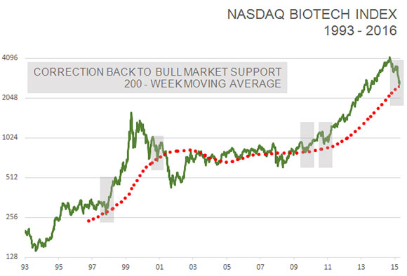 Furthermore, the NASDAQ biotech index has corrected back to its 200-week moving average for the first time since the bull market began in 2011. It has served as a good starting point for new bull markets four out of the past five times since 2002.