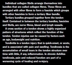Achilles tendinosis is a painful overuse injury that affects the lower leg. Often caused by a cycle of injury, improper healing and re-injury, chronic tendinosis is an accumulation of micro-tears which leads to structural degeneration of the tendon associated with weakness, loss of function, chronic pain and susceptibility to re-tearing and further injury.