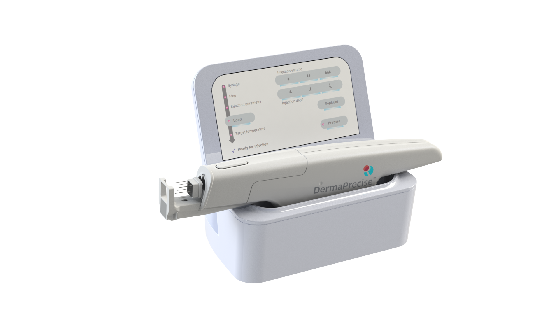 The DermaPrecise Injector Product Line is comprised of a desktop touchscreen control unit wired to a handheld electronic injector wand with a push-button trigger rather than a manual plunger. In addition to offering unparalleled electronic control and consistency of injection depth and dose, the injector includes a cooling element intended to cool the skin to minimize sensation prior to injection. The proprietary consumables include two different multi-needle heads, syringe cartridges, and liners.